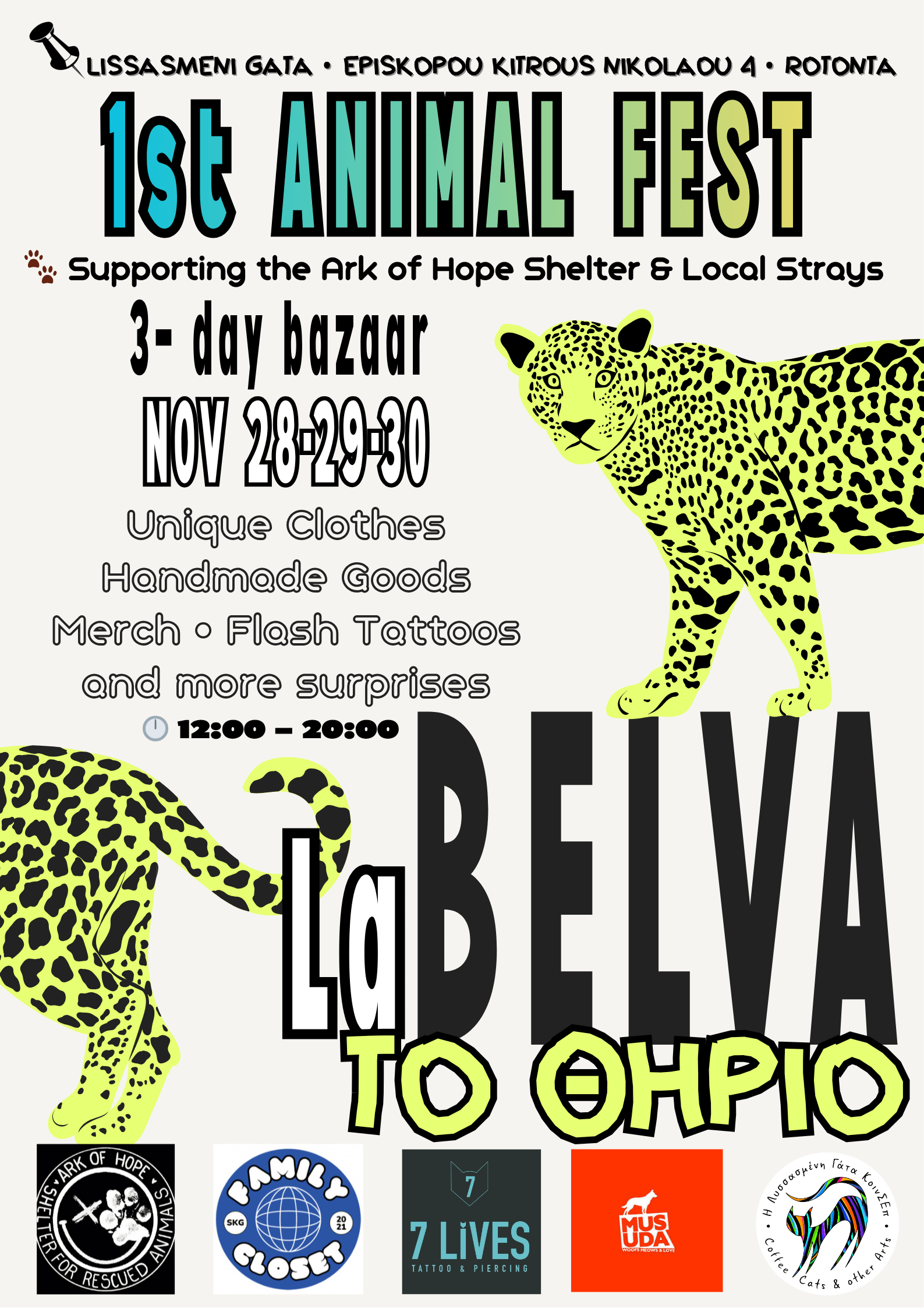 Το πρώτο Animal fest, με τίτλο La Belva – δηλαδή Το Θηρίο – έρχεται με ένα τριήμερο φιλοζωικό bazaar. Για τρείς μέρες γεμάτες shopping, δημιουργικότητα και αλληλεγγύη για τα ζώα. Από τις 28 έως τις 30 Νοεμβρίου, στο φιλόξενο Λυσσασμένη Γάτα Art Café οι επισκέπτες θα έχουν την ευκαιρία να ανακαλύψουν: