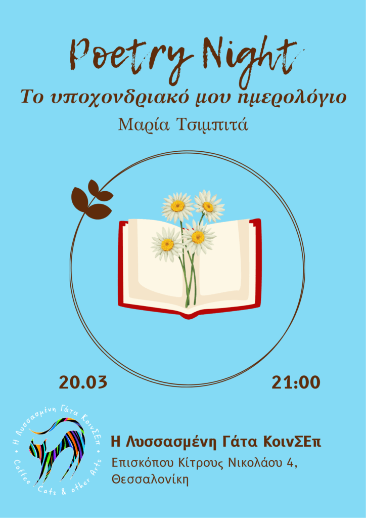 Poetry Night: «Το Υποχονδριακό μου Ημερολόγιο» Ελάτε να γιορτάσουμε μαζί τον ερχομό της άνοιξης με μια βραδιά ποίησης. Με αφετηρία…